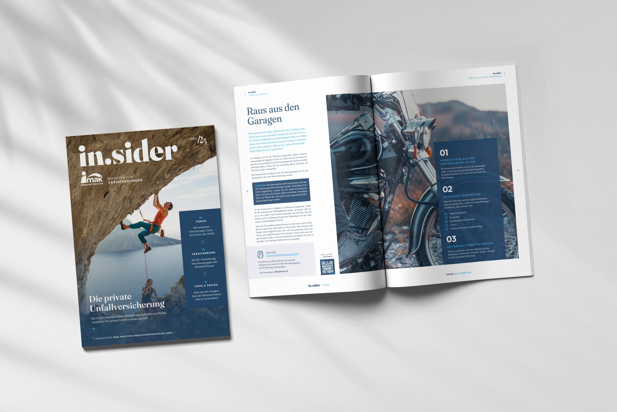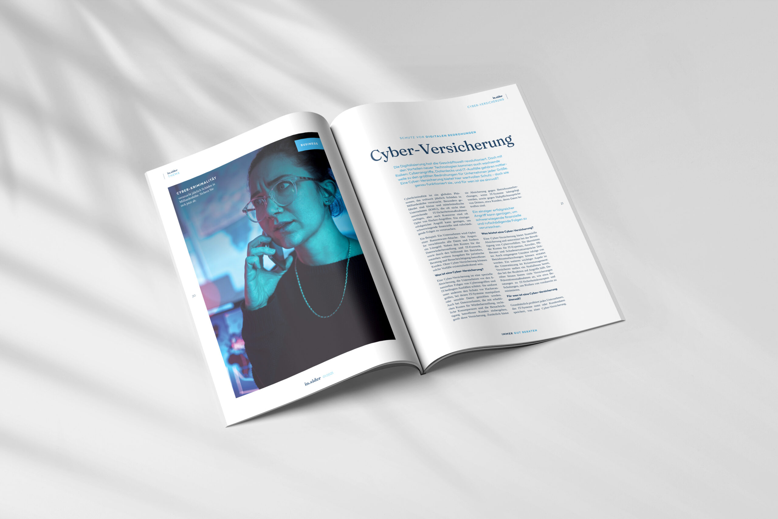 Für einen Versicherungsmakler durfte ich das grafische Konzept und die Umsetzung des hauseigenen Fachmagazins übernehmen. Das Magazin, das 4-mal jährlich erscheint, soll exklusive Einblicke in die Versicherungswelt bieten und das teils schlechte Image der Versicherungen bereinigen.